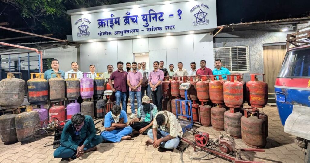 नाशिक | दि. ८ एप्रिल २०२६: घरगुती एलपीजी गॅस सिलिंडरमधील गॅस बेकायदेशीररीत्या व्यावसायिक सिलिंडरमध्ये भरून काळाबाजार करणाऱ्या टोळीचा नाशिक गुन्हे शाखा युनिट क्र. १ आणि भद्रकाली पोलिसांनी संयुक्त कारवाईत पर्दाफाश केला. या प्रकरणात चार आरोपींना अटक करण्यात आली असून मोठ्या प्रमाणात साहित्य जप्त करण्यात आले आहे.