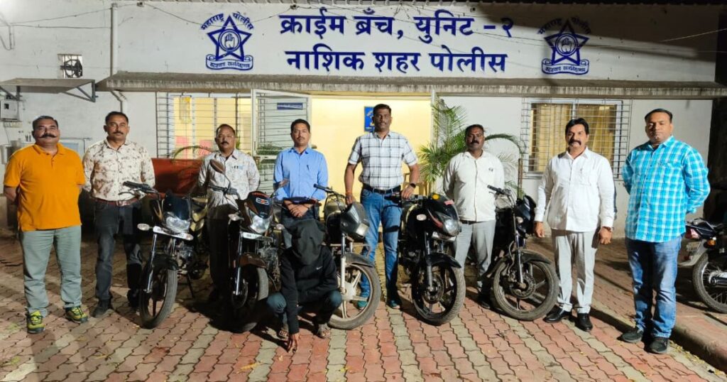नाशिक। दि. २५ जानेवारी २०२६: गुन्हेशाखा युनिट क्रमांक ०२ च्या पथकाने चोरीच्या मोटारसायकल विक्रीसाठी आलेल्या इसमाला दिंडोरी रोड परिसरातून अटक करत २ लाख ७० हजार रुपये किंमतीच्या पाच मोटारसायकली जप्त केल्या. या कारवाईमुळे शहरातील विविध पोलीस ठाण्यांतील एकूण पाच गुन्हे उघडकीस आले आहेत.