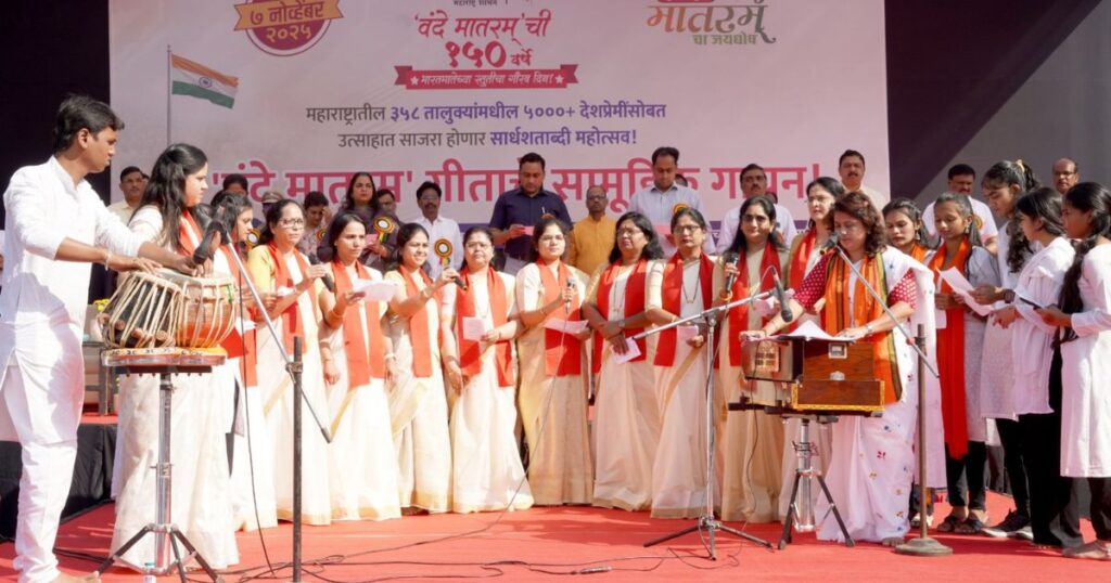 बंकिमचंद्र चटोपाध्याय लिखित ‘वंदे मातरम्’ या गीतास 150 वर्षे पूर्ण झाल्यानिमित्त कौशल्य, रोजगार, उद्योजकता आणि नाविन्यता विभाग व सांस्कृतिक कार्य विभाग यांच्यातर्फे आज सकाळी महात्मा नगर मैदानावर ‘वंदे मातरम्’ या गीताचे सामूहिक गायन करण्यात आले. त्यावेळी ते बोलत होते.