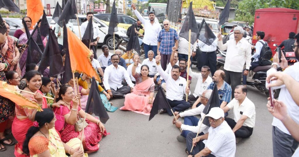 नाशिक। दि. ८ ऑक्टोबर २०२५: खड्डे बुजवून रस्त्यांचे खडीकरण, डांबरीकरण करण्यासाठी मंगळवारी प्रभाग क्रमांक २४ मध्ये शिवसेना (उद्धव बाळासाहेब ठाकरे) पक्ष व सत्कार्य फाउंडेशनच्या नेतृत्वाखाली नागरिकांनी मंगळवारी, ७ ऑक्टोबर रोजी सिटी सेंटर मॉल सिग्नलवर रास्ता रोको करत ठिय्या केला. घोषणाबाजी करीत सरकारसह महापालिका प्रशासनाचा निषेध केला. महापालिका अधिकार्यांच्या आश्वासनानंतर हे आंदोलन मागे घेण्यात आले.