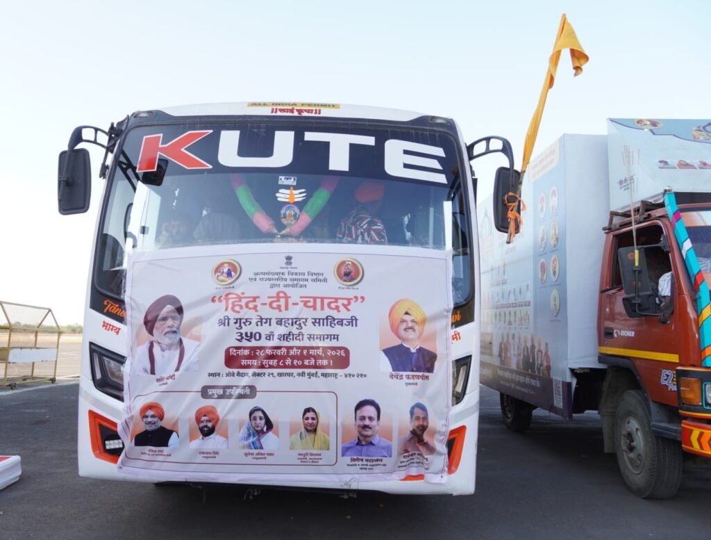 नाशिक। दि. २७ फेब्रुवारी २०२६: खारघर, मुंबई येथे 28 फेब्रुवारी व 1 मार्च, 2026 रोजी हिंद दी चादर श्री गुरु तेग बहादुर साहिबजी यांच्या 350 व्या शहीदी समागम निमित्त कार्यक्रम होणार आहे. या कार्यक्रमासाठी नाशिक जिल्ह्यातून जाणाऱ्या भाविकांच्या बस व चित्ररथास मुख्यमंत्री देवेंद्र फडणवीस यांनी हिरवा झेंडा दाखवून ओझर विमानतळ येथून मार्गस्थ केले.