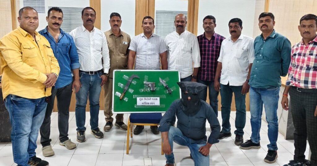नाशिक (प्रतिनिधी): चारचाकी वाहनातून गावठी कट्टा, कोयते आणि चॉपर घेऊन फिरणाऱ्यास नाशिक शहर पोलिसांच्या गुंडा विरोधी पथकाने अटक केली आहे. गुंडा विरोधी पथक नाशिक शहरात अवैध शस्त्रे व सराईत गुन्हेगार चेक करुन त्यांचेवर वेळोवेळी कारवाई करीत आहे.