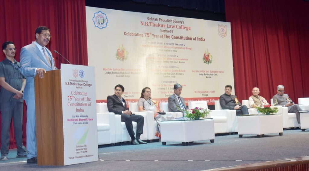 नाशिक। दि. २७ सप्टेंबर २०२५: भारतीय राज्यघटनेने नागरिकांना दिलेले मुलभूत अधिकार व संविधानाची तत्वे आपणास कायम मागदर्शक ठरली आहेत. कायद्याचे शिक्षण घेतांना विद्यार्थ्यांनी संविधानातील नीतिमुल्ये स्वीकारून प्रत्येक नागरिकांना न्याय मिळेल यादृष्टीने दक्ष राहून वाटचाल करावी, असे प्रतिपादन सर्वोच्च न्यायालयाचे सरन्यायाधीश भूषण गवई यांनी केले.